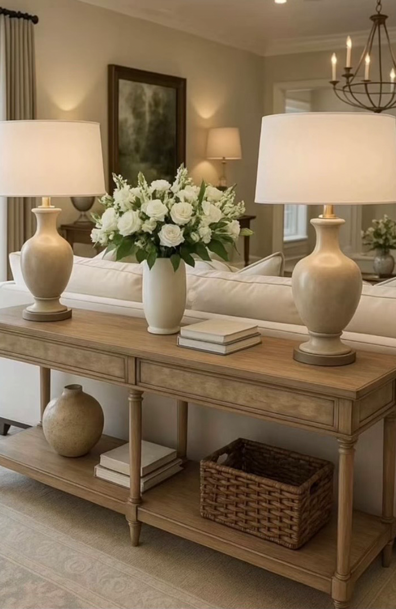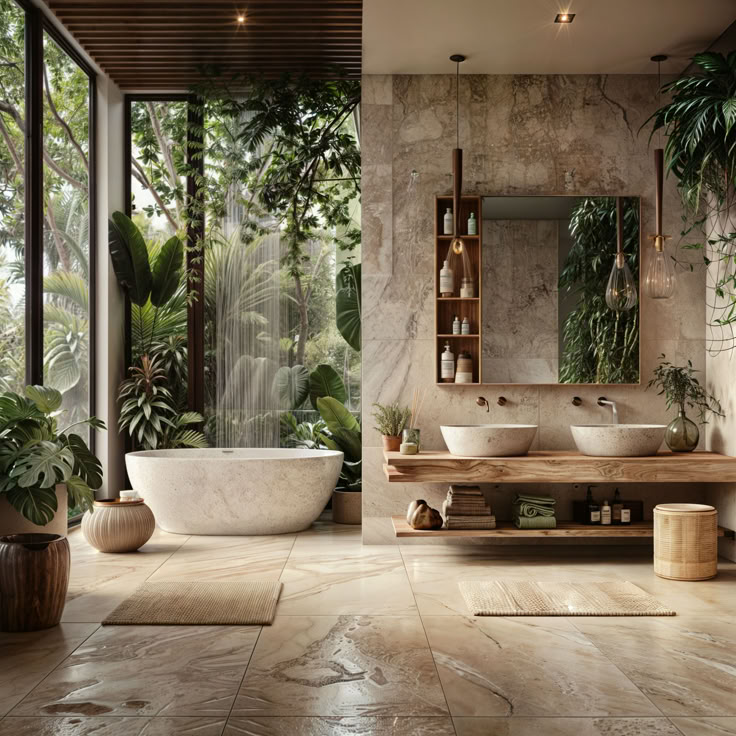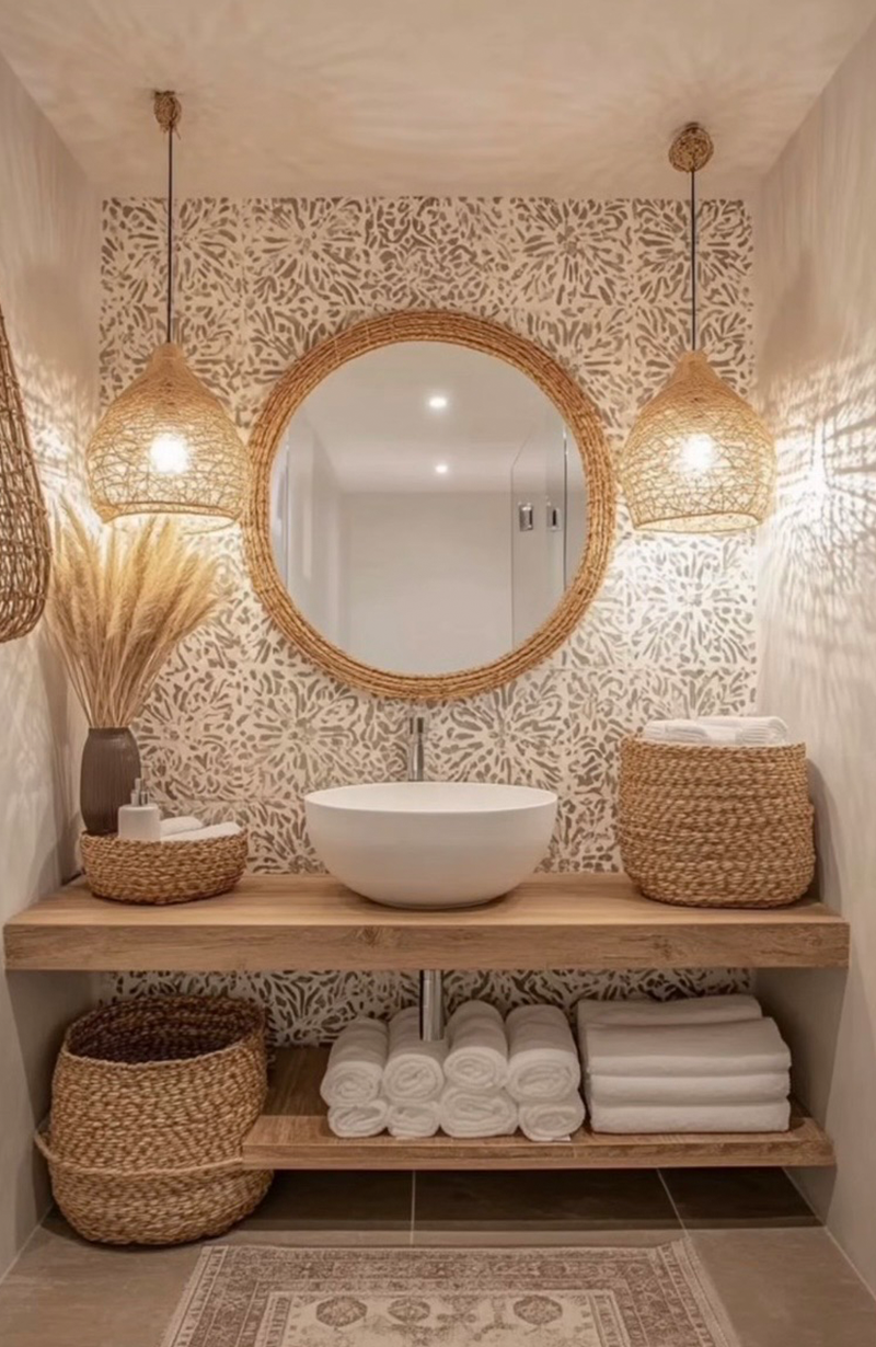 Color palettes include earthy tones such as sand, terracotta, olive green, and warm browns. Materials like linen, cotton, raw wood, stone, and rattan are central to the design. Indoor plants play a key role in enhancing vitality and air quality. Decorative objects are handcrafted, simple, and authentic, reinforcing a sense of serenity and natural harmony.
